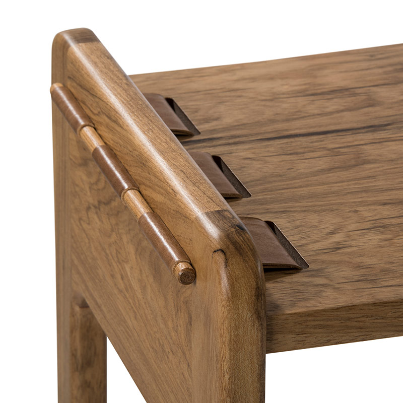 - Em madeira com detalhes em couro