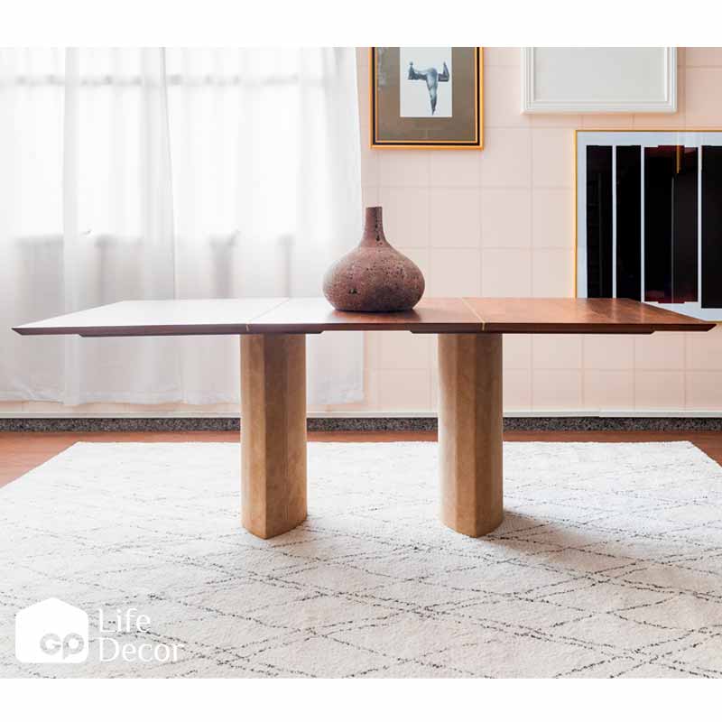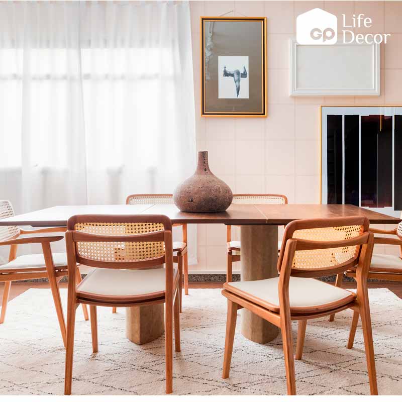 A mesa de jantar, assinada pelo Studio Mapa.A, é modulada e foi pensada para atender diversos tamanhos, com um delicado detalhe metálico nas juntas superiores. Com linhas simples, mas com combinações de materiais, como madeira, couro e metal, a mesa é perfeita para qualquer projeto.