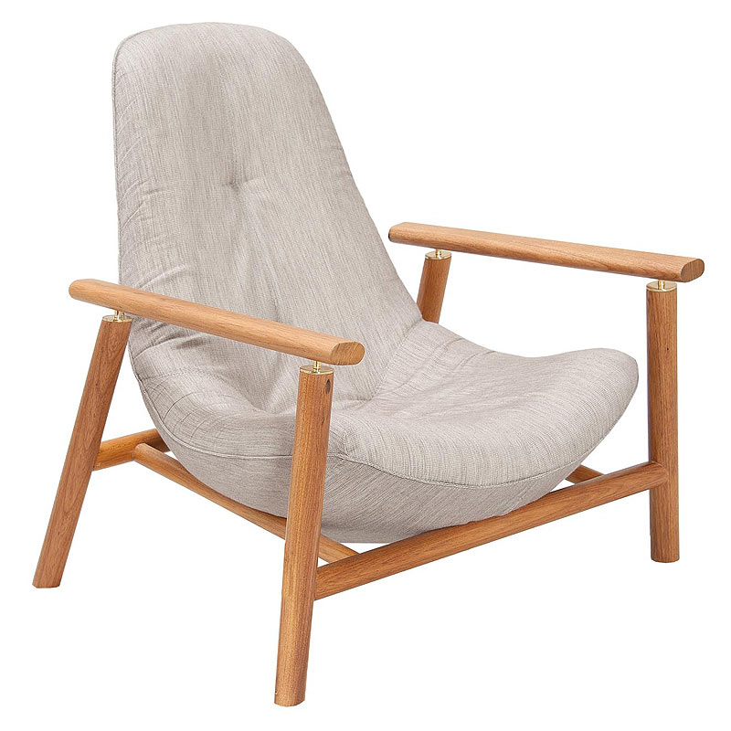 “Esta poltrona tem forma do assento curvilínea que contrasta com a base retilínea de madeira. A estrutura é de madeira maciça e parece ser um elemento totalmente independente da concha do assento, que se apoia levemente sobre a base. Procuramos aqui uma relação de dualidade e contraste entre as estruturas“. – Studio Lattoog