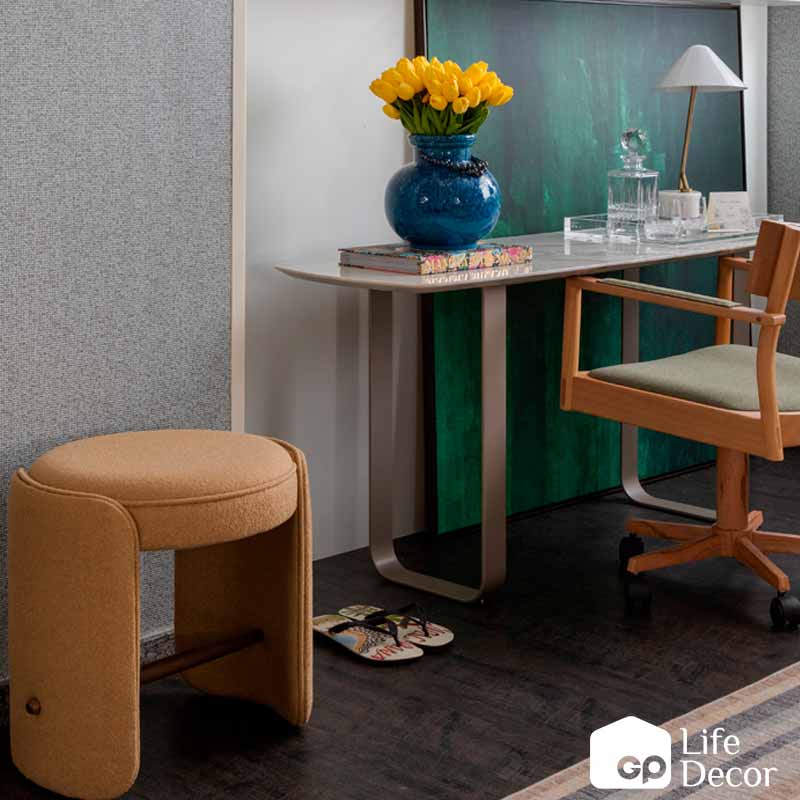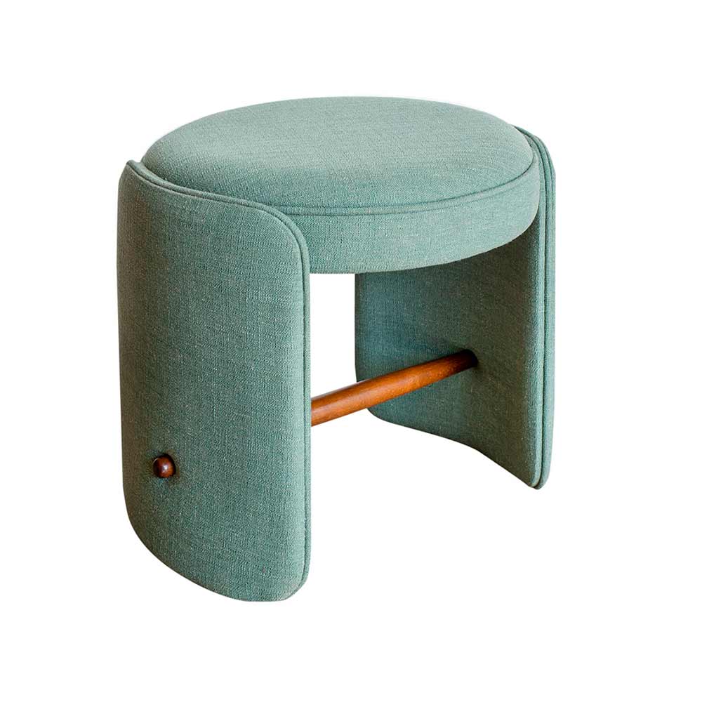 Móveis de apoio são sempre bem-vindos, ainda mais quando possuem medidas enxutas e são fáceis de transportar pela casa. O pufe Pli, revestido em tecido e com detalhes em madeira, é uma ótima opção.